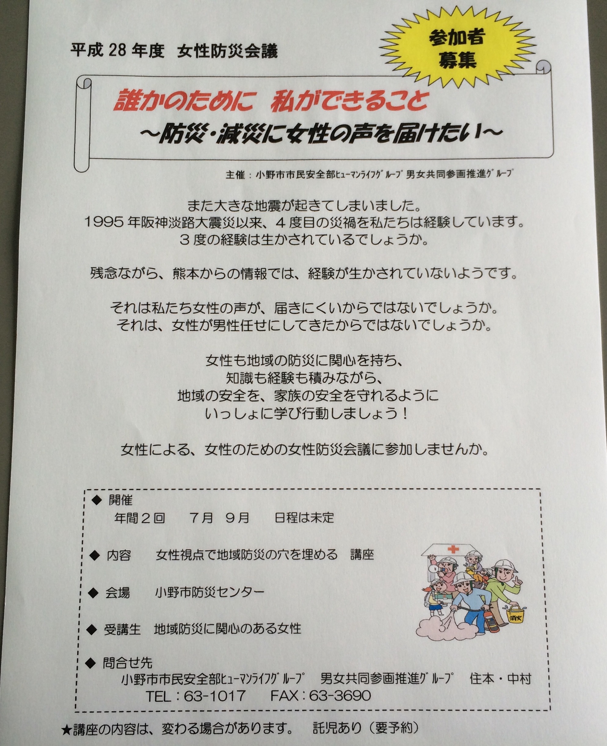 託児もありますので、地域防災に関心のある女性は、ぜひ参加してみてください。